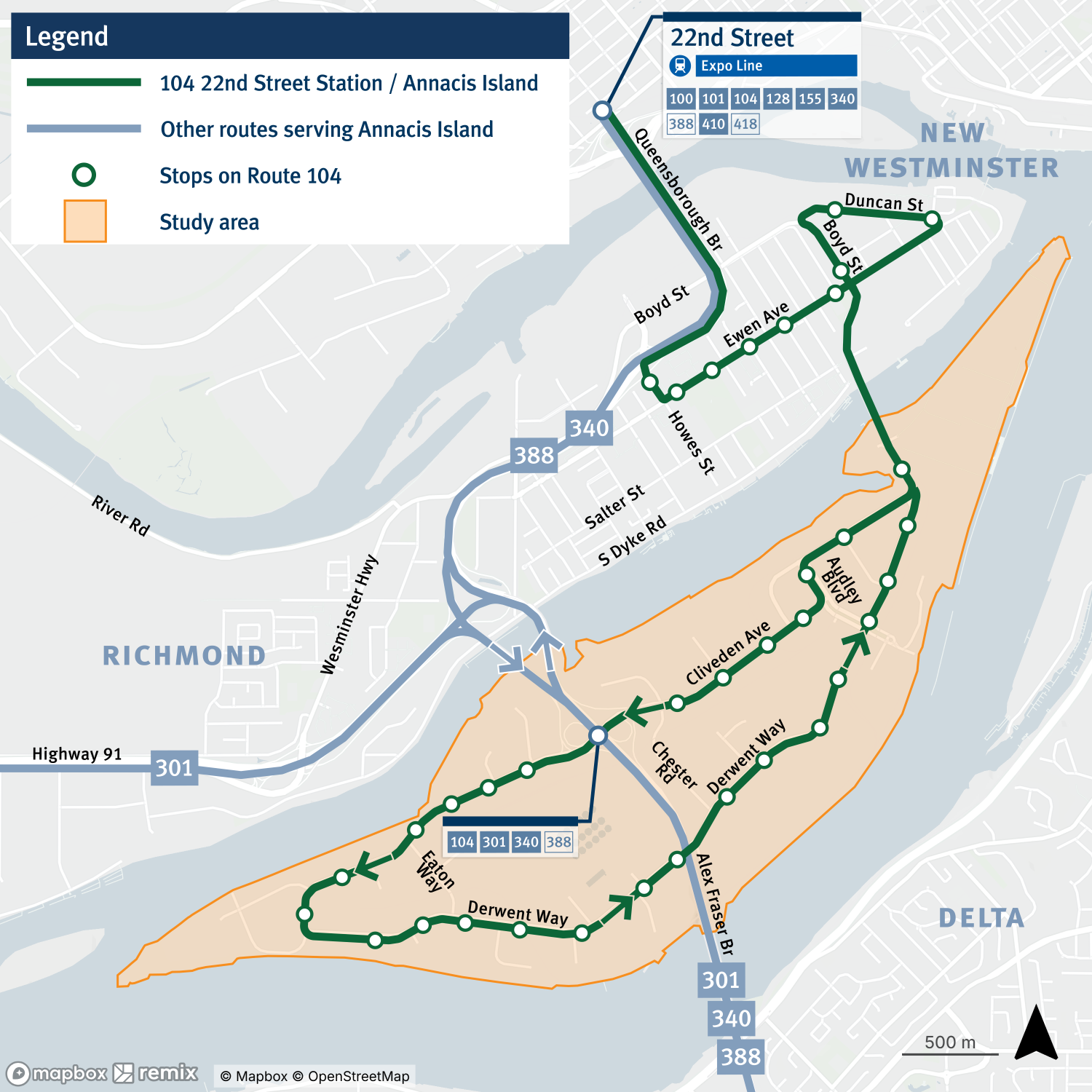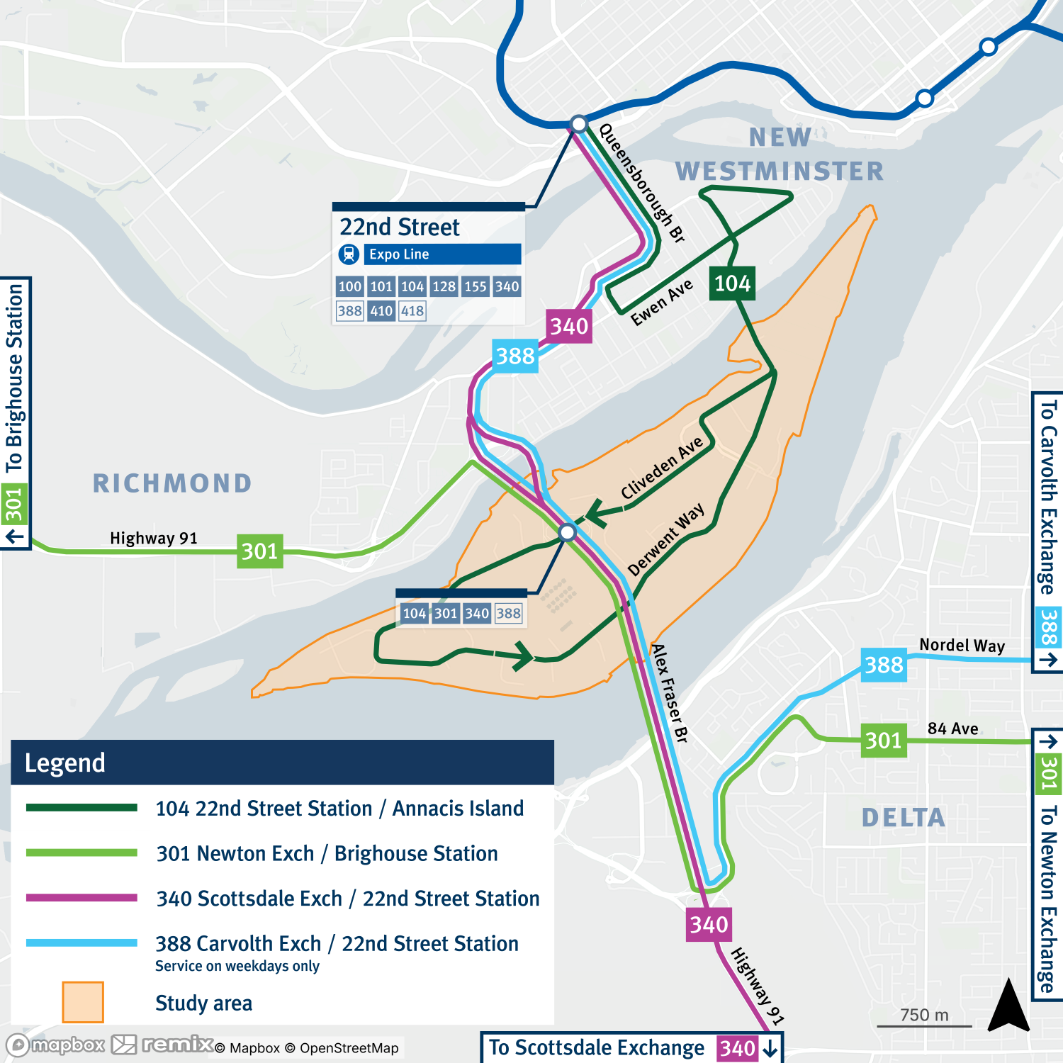 TransLink is exploring bus service improvements to better serve the Annacis Island Industrial Area and those who work there. While the area is currently served by routes 104, 301, 340, and 388, we are looking at ways to increase service to support businesses and their employees. Aligned with the 2025 Investment Plan’s focus on expanding transit service to better connect people to jobs, Annacis Island is a key employment area expected to support more than 14,000 jobs in the next 10 years.