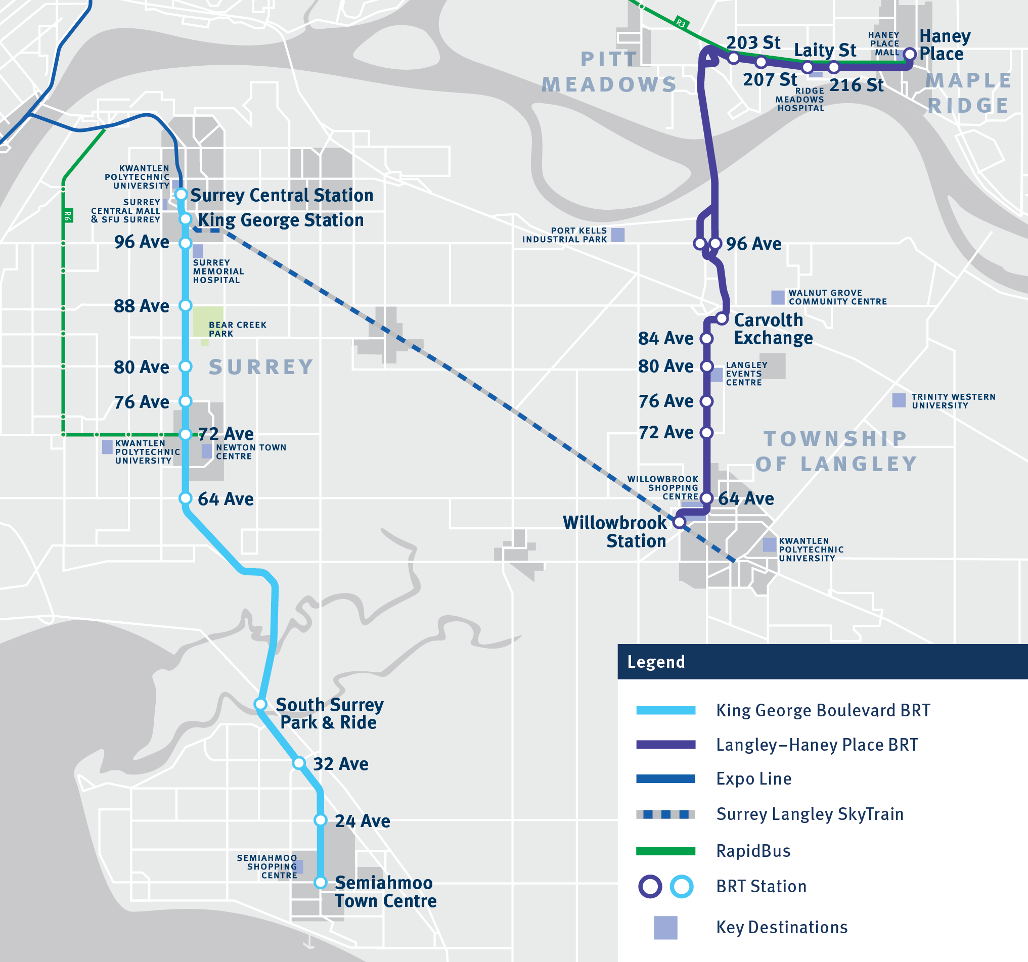 King George Boulevard BRTKing George Boulevard BRT will introduce an additional 19 kilometres of rapid transit service to Surrey, featuring 12 stations. It will provide a direct connection between Surrey City Centre and Semiahmoo Town Centre, reducing travel time by 40% to approximately 40 minutes.
