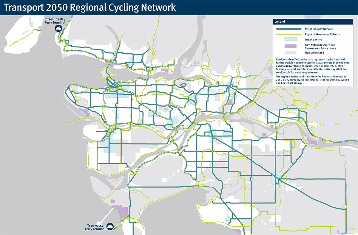 - Implementing complete networks of traffic-protected bikeways within every urban centre, an 850-kilometre network of major bikeways (map) connecting every urban centre, and abundant bicycle parking everywhere in order to provide active transportation and recreation options that are comfortable for most people to use.